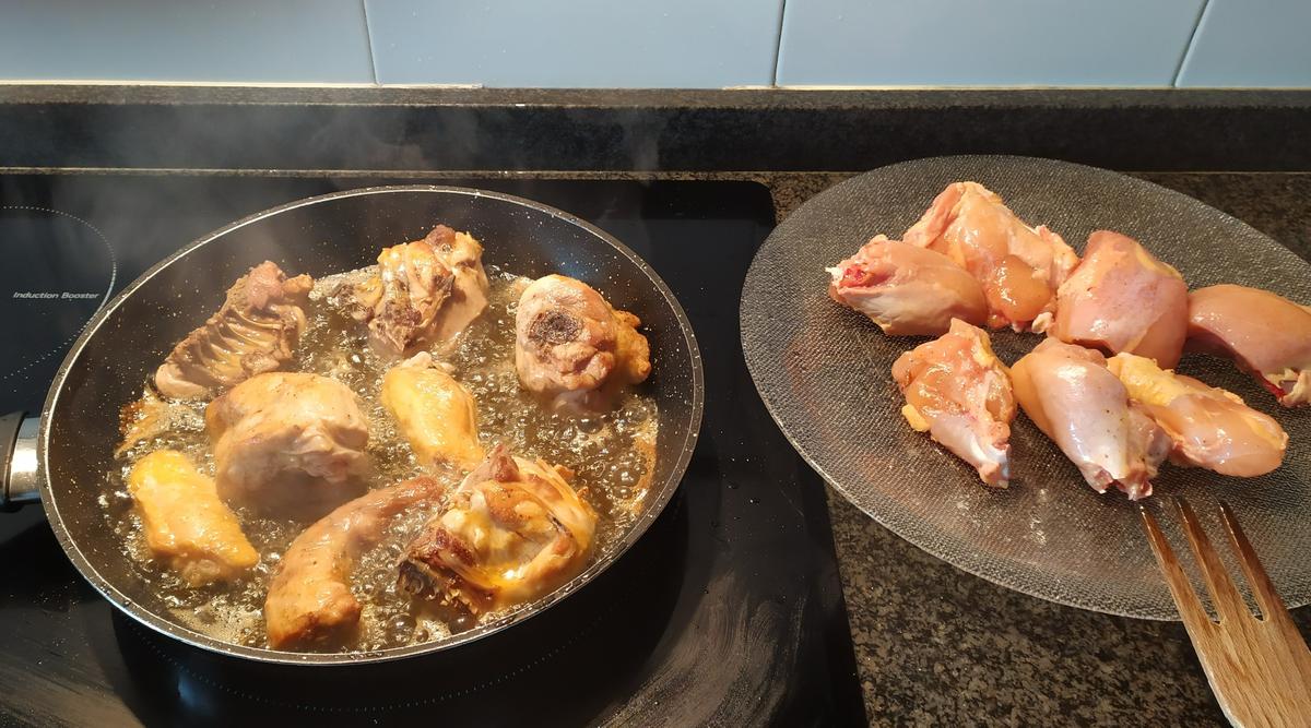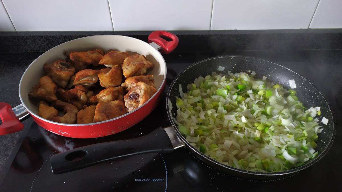 Lo primero que haremos será dorar los trozos de pollo en la sartén y los pasaremos después a la cazuela. A continuación pocharemos las verduras en el mismo aceite y las añadiremos escurridas también a la cazuela.
