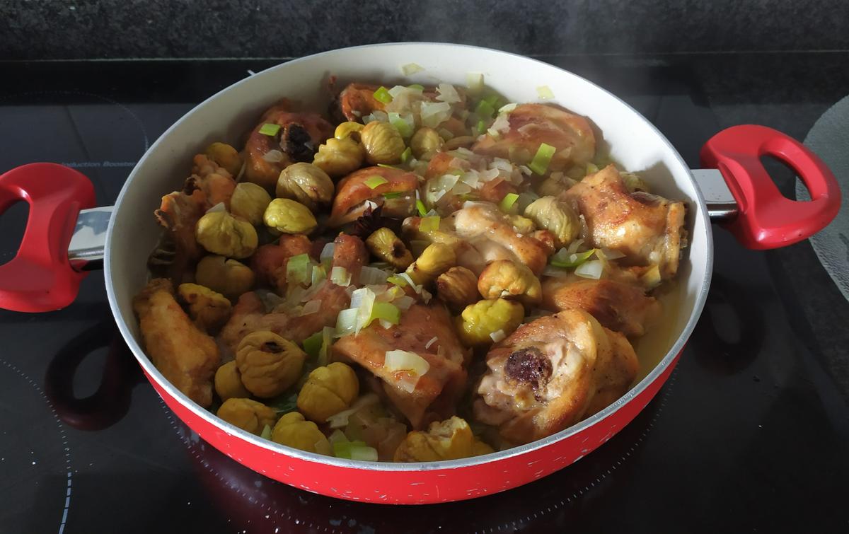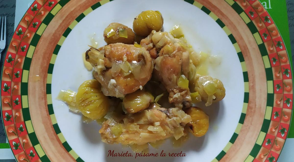La castaña se presta muy bien como aliado de muchos platos, en la receta que os traigo hoy forman un dueto exquisito con el pollo, acompañados de un coro de cebolla, ajo y puerro, cuyo resultado es una armonía perfecta de sabores. Un guiso delicioso y muy fácil de preparar para el que necesitaréis estos ingredientes (cantidades para seis comensales más o menos):