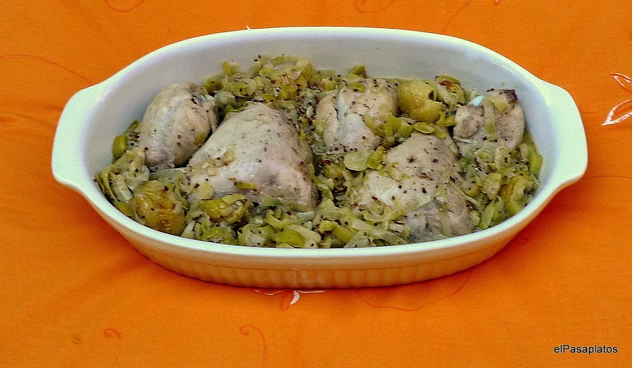 Añadimos a los puerros dos cucharadas de mostaza. Mezclamos con una cuchara de madera y raspamos el fondo para incorporar los restos de dorar el pollo.