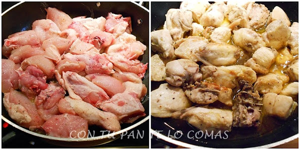 1. En una cazuela con un poco de aceite de oliva sofreír los trozos de pollo (salpimentados) hasta que estén dorados, a fuego vivo.