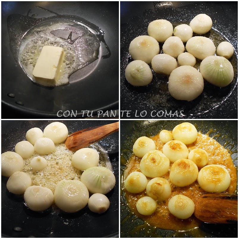 4. En otra sartén ponemos a derretir la mantequilla y salteamos las cebollitas con un poco de sal. Añadimos las cucharadas de miel y bajamos el fuego para que se vayan haciendo, removiendo muy a menudo para que se vayan dorando y haciendo por dentro. La salsita espesará un poco y hay que vigilar que no se queme.