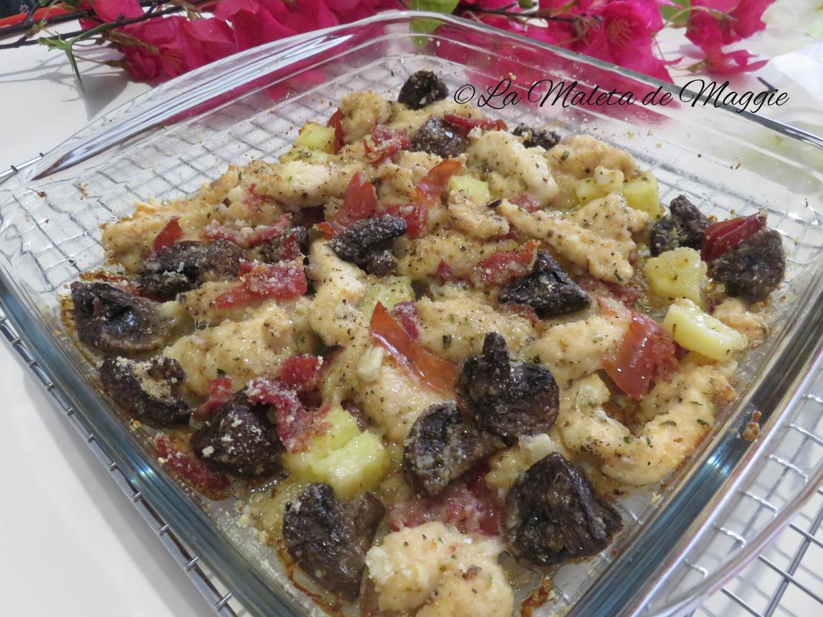 Verteremos los ingredientes en un recipiente para el horno, repartiremos bien los ingredientes por toda la bandeja.