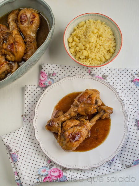 He acertado de lleno en mi elección. Menuda receta buena, facilona y rápida que le he mangado a Rosa. Con esa salsa tan rica, de toma pan y moja. Os puedo asegurar que ya se ha convertido en una receta de cabecera, para hacer con muslos, como en esta ocasión, con pechuga, con un pollo entero, con solomillos, con cinta de lomo...Vamos que lo pienso probar de todas las maneras.