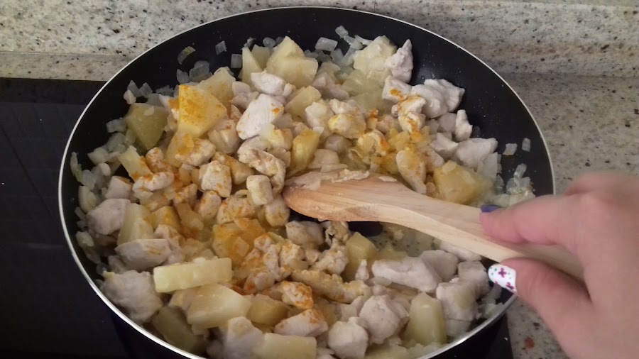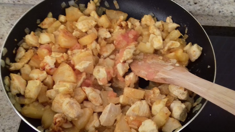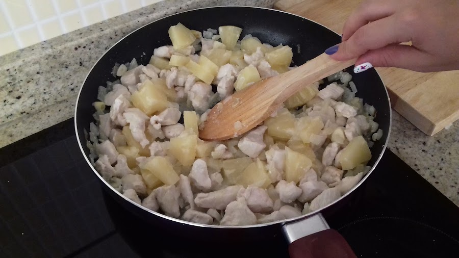 Añadimos el pollo cortado y las rodajas de piña cortadas en trocitos y doramos . Reservamos el jugo de la lata de piña.