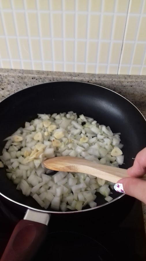 Echamos aceite en una sarten, sofreimos la cebolla y los ajos.