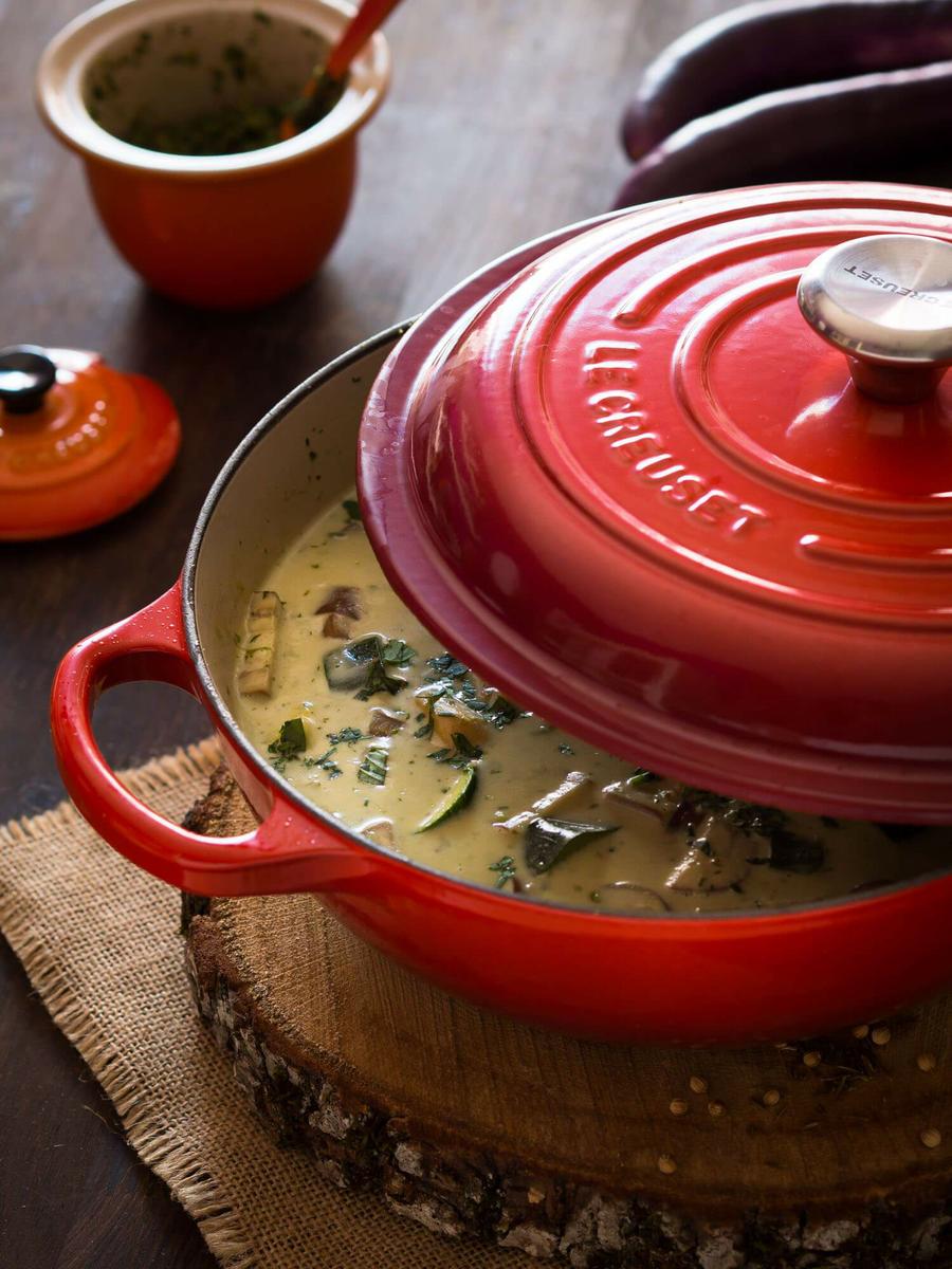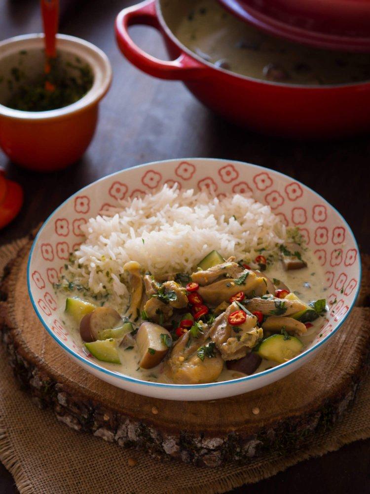 Para cocinar el curry he utilizado la marmita que ves en la foto. Es una novedad de esta temporada de la marca Le Creuset. Es algo más baja que una cocotte normal pero tiene suficiente fondo para hacer “chup-chup”. También es ideal para hacer salteados, ya que su forma es como un wok, es decir, una base estrecha que se ensancha luego.