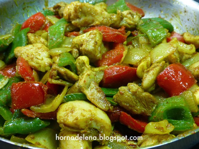Este plato de pollo con curry lo hago muy a menudo en casa y se convierte en un plato de aprovechamiento. Tenemos otra receta parecida, algo más básica, ya que solo usa el pimiento verde y la cebolla.