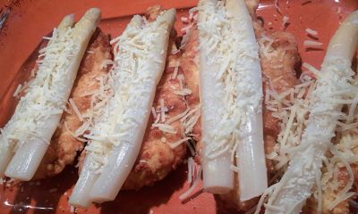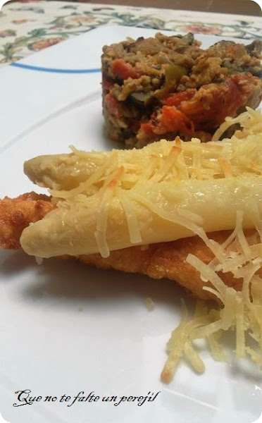 Ponlas en una fuente o bandeja de horno, coloca encima de cada una de ellas dos espárragos y espolvorea el resto del queso rallado.