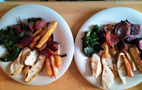 Pasados los 20 minutos incorporamos el pollo a la bandeja del horno junto con los vegetales y lo dejamos hasta que esté tierno unos 20 minutos más.