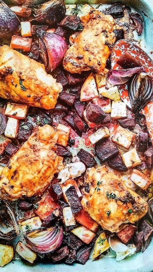 Calentamos el horno a 180º. En una bandeja de horno ponemos las remolachas, las chirivías, nabos, cebollas y los ajos enteros. Añadimos el aceite, una cucharada de tomillo, la mitad de la ralladura del limón, las semillas de hinojo y el zumo de limón. Lo removemos bien para que se impregnen bien los sabores y lo dejamos en el horno 20 minutos.