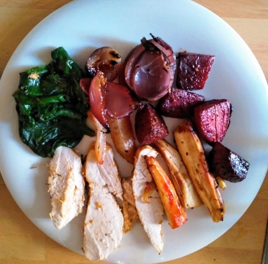 5 minutos antes de que esté hecho el pollo hacemos las espinacas en una sartén con el resto del ajo aplastado y un poquito de aceite. Podemos añadir si queremos el resto de yogur para acompañar el plato.