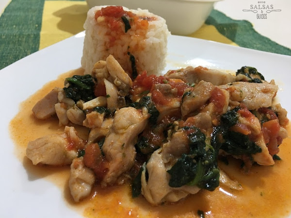 Añade las espinacas y ¼ de cta de sal y sofrie 4 min, 120 º (varoma) giro a la izq. vel 1 (ayúdate de las espátula en el primer momento para que bajen bien las espinacas). Mientras pon el pollo cortado a tiras en un bol y espolvorea con la pimienta y ¼ de cta de sal. Cuando finalice el tiempo vierte el contenido del vaso sobre el pollo y mezcla bien.