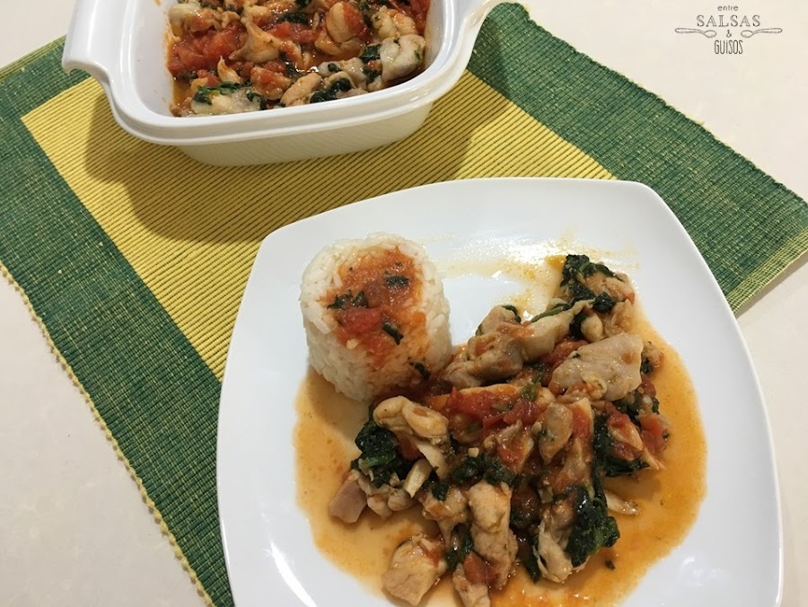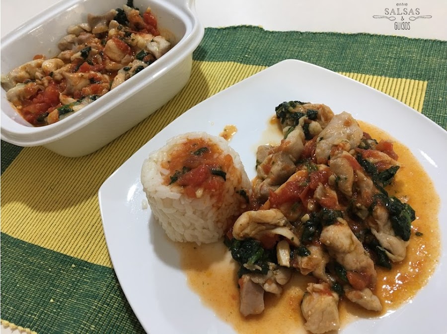 Retira la bandeja y pon el pollo en una fuente, mezcla el tomate con el pollo y sirve.Nota. Si te queda el tomate muy líquido, puedes quitar el pollo y dejar el recipiente varoma sin tapar y programar 5 min, varoma , giro a la izq, vel 1 para reducirlo. A mi no me hizo falta porque tuve el pollo 20 minutos en lugar de 15.