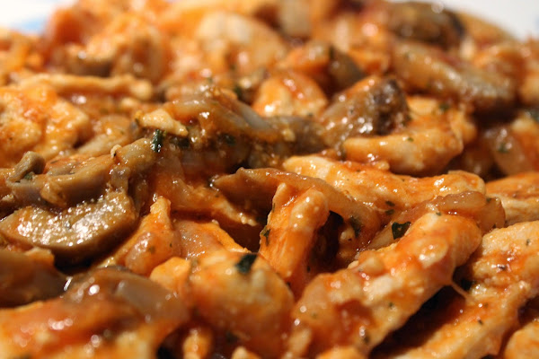 Lo primero que vamos a hacer es echar un chorrito de aceite de oliva en la sartén. Cuando tengamos el aceite caliente, echamos la cebolla bien picada y el ajo, sofreímos hasta que quede pochado. Veremos que la cebolla esta pochada echamos la pechuga de pollo cortadas en trozos pequeños y los champiñones, lo hacemos. Cuando este apunto de hacerse echamos primero la hierbabuena sobre el pollo y lo hacemos durante un par de minutos, echamos ahora el tomate frito o también podemos echar tomate triturado natural y un chorrito de salsa barbacoa.