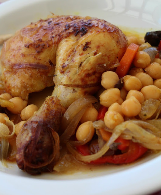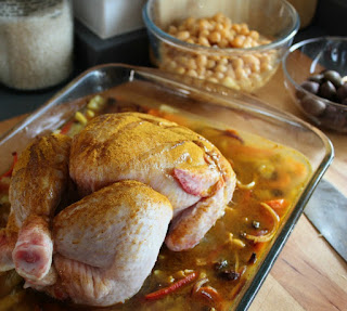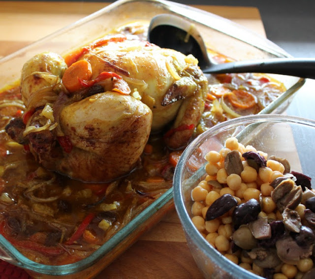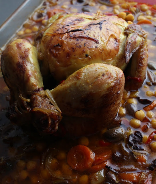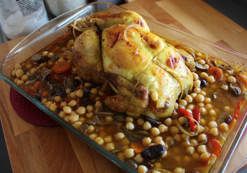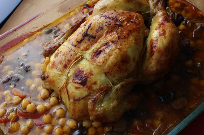 Ponemos el pollo y bañamos con el caldo el conjunto. Pintamos el pollo con aceite y le espolvoreamos el resto de Ras el hanout.