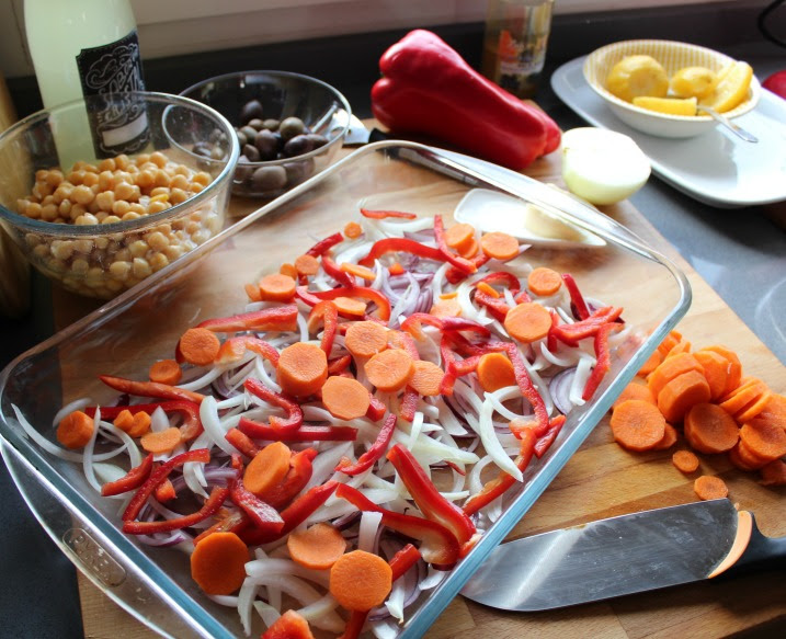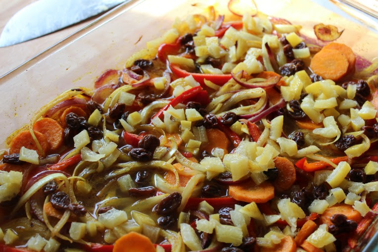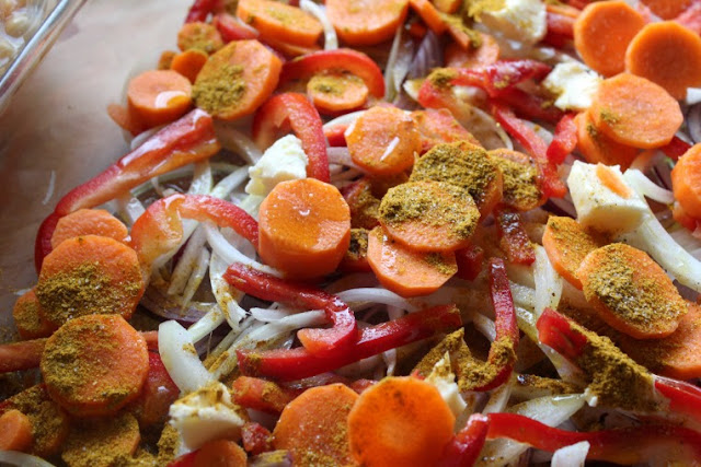 En la bandeja de hornear (Pedazo de Pyrex), ponemos el "mix" que acabamos de trocear. Un poco de aceite de oliva, la mantequilla y una cucharada de Ras el hanout.