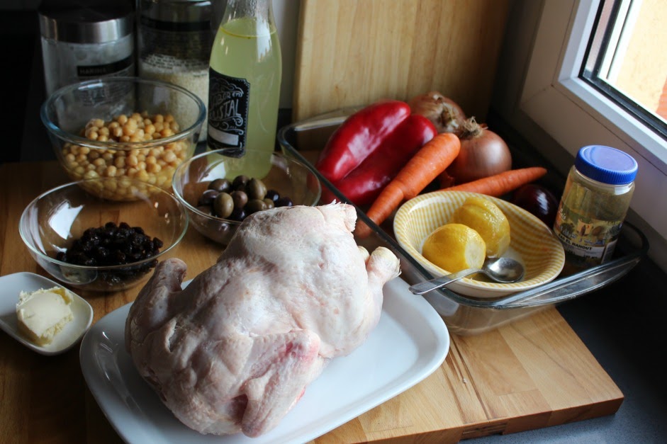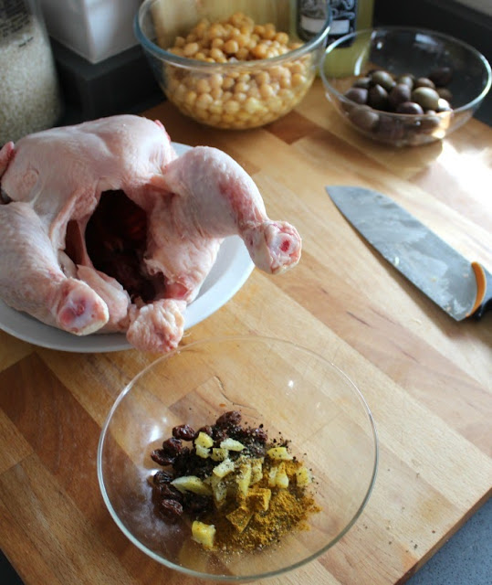 Mezclamos una cucharada de limón confitado, troceado, una cucharada de pasas de corinto y un pellizco de Ras el hanout y lo introducimos dentro del pollo.