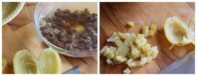 Hervimos un poco de agua. Ponemos las pasas en un bol y cubrimos con agua hirviendo. Picamos la piel de los limones en salmuera.