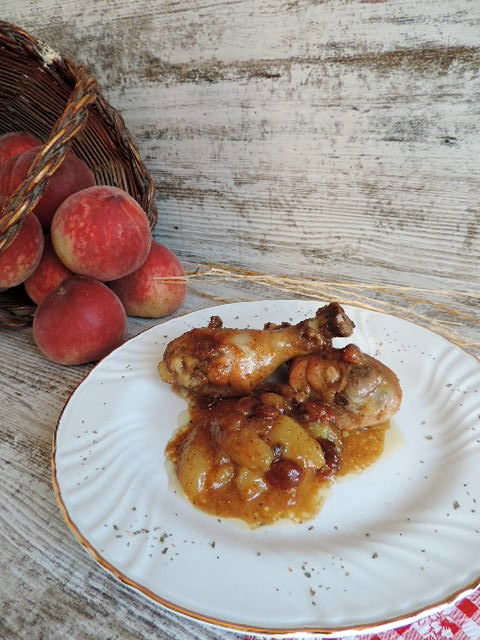 Añadimos el melocotón cortado y las pasas con la mermelada,removemos bien para que se impregne el pollo.Dejamos unos minutos hasta que la mermelada reduzca un poco.