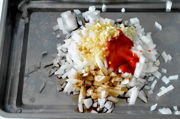 Ponemos la cebolla y el ajo en la fuente del horno y les añadimos la salsa de soja, la miel y la salsa sriracha. Removemos bien.
