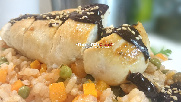 Colocamos una base o cama con el arroz rojo. Sobre ella disponemos la pechuga de pollo y regamos con el Mole. Espolvoreamos sésamo tostado por encima y listo. ¡Que aproveche, hitchcookian@s!