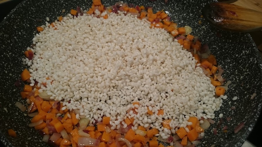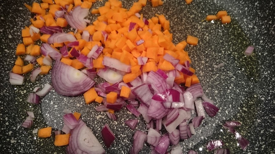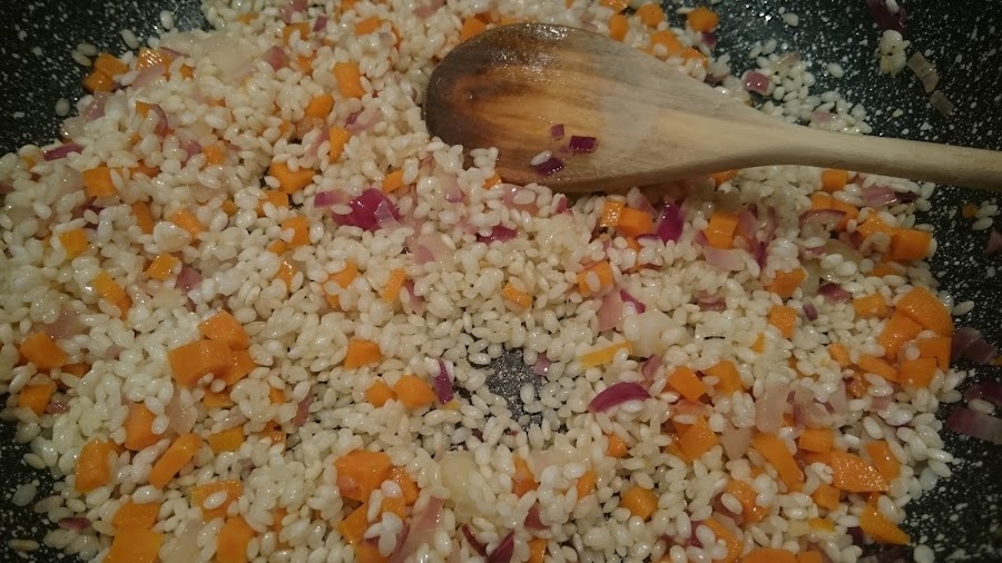 Ponemos en una sartén amplia 2 cdas de aceite de oliva y sofreímos unos minutos la cebolla roja troceada y la zanahoria. Añadimos el arroz (ya colado) y salteamos un par de minutos más.