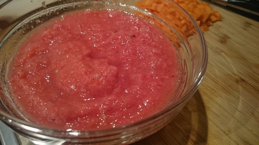 Con ayuda de la Thermomix o de una licuadora, vamos a triturar los tomates, la cebolla, el ajo con un poco de caldo de pollo o agua. Batimos hasta conseguir una pasta.