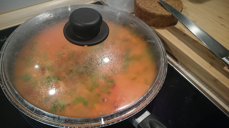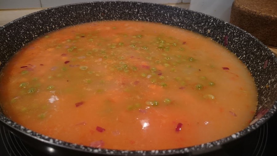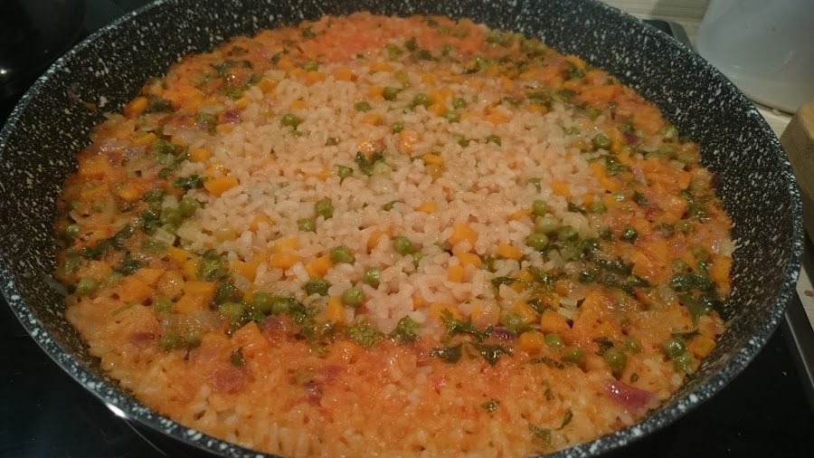 Cubrimos de caldo de pollo o agua (mejor que esté caliente, para que le cueste menos cocer) Añadimos los guisantes y espolvoreamos cilantro fresco. Cuando rompa el primer hervor bajamos el fuego, cubrimos la sartén con una tapadera y dejamos cocinar durante 20-22 minutos. Pasado el tiempo dejamos reposar tapado unos 10-15 minutos más.
