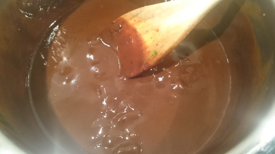 Ponemos en una cazuelita la pasta o el polvo de mole (las cantidades dependerán de cuánta cantidad queráis preparar) y empezamos a calentarlo removiendo constantemente.