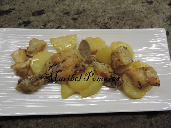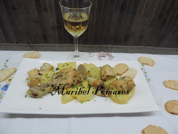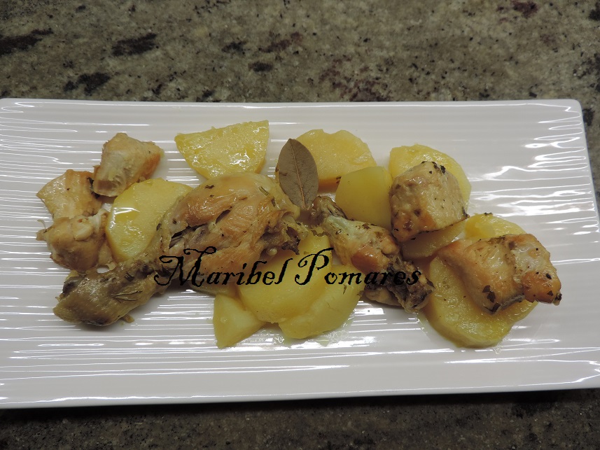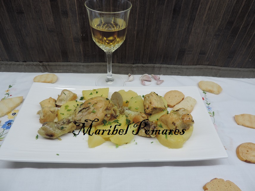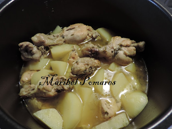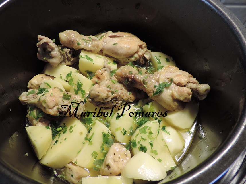 Mezclamos bien las patatas con el pollo para que se queden bien mojadas con el caldo, ponemos un poco de perejil picado de nuevo.