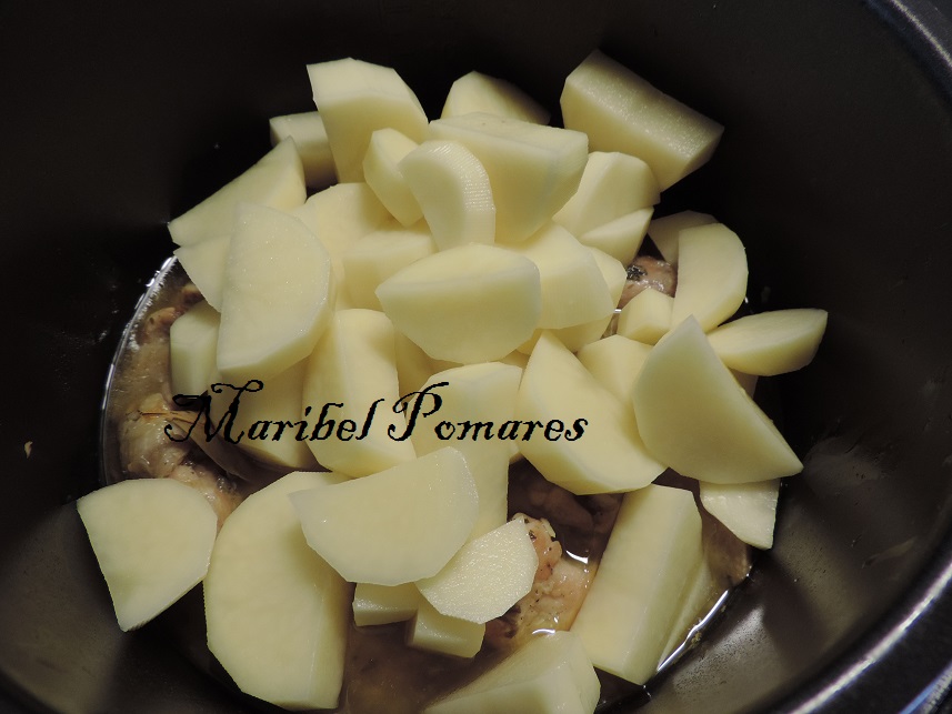 Dejamos que salga el vapor y destapamos la olla para añadir las patatas cortadas den trozos.