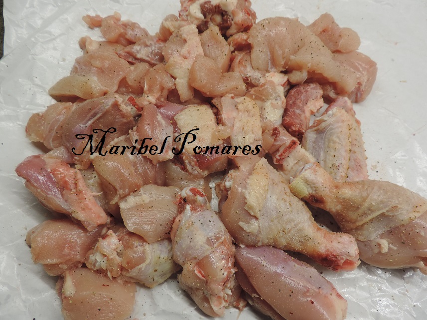Cortamos el pollo en trozos y le ponemos sal y pimienta.