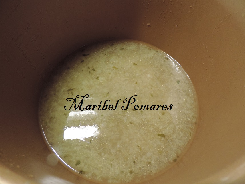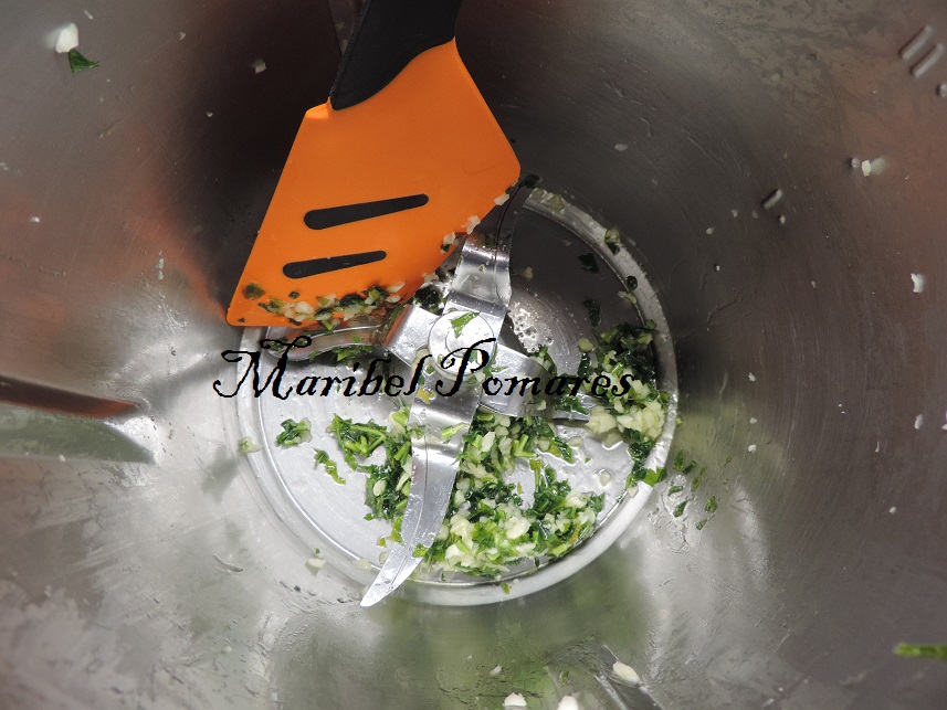 Programamos el thermomix unos 10 segundos, velocidad 5 y añadimos por el vocal los dientes de ajo y el perejil para picarlos.Cuando acabe el tiempo ponemos la cucharada de aceite de oliva y mezclamos bien con la espátula.