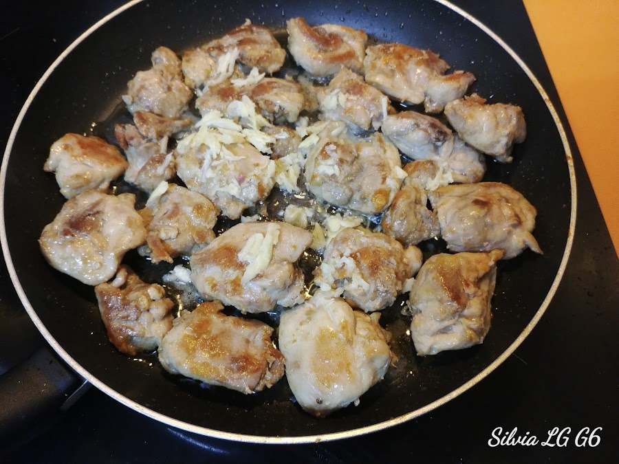 Una vez dorado el pollo, vamos a hacer un majado con los ajos y 4 cucharadas de vinagre. Lo removemos bien y lo echamos por encima del pollo.