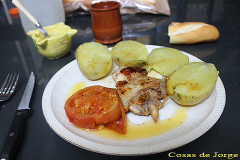 Otra curiosidad de esta receta es que las patatas son “asadas” al microondas y que el pollo esta deshuesado.