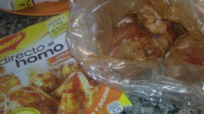 Echamos el contenido del sobre en la bolsa, añadimos el pollo, y lo removemos bien, para que se peguen por todo el pollo.