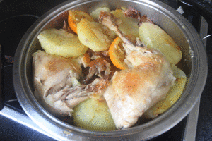 Dejamos cocerse hasta que las patatas estén casi tiernas y el pollo blandito, alrededor de 45 minutos, vigilando y dando la vuelta, con cuidado de no romper las patatas cada 15 minutos aproximadamente.