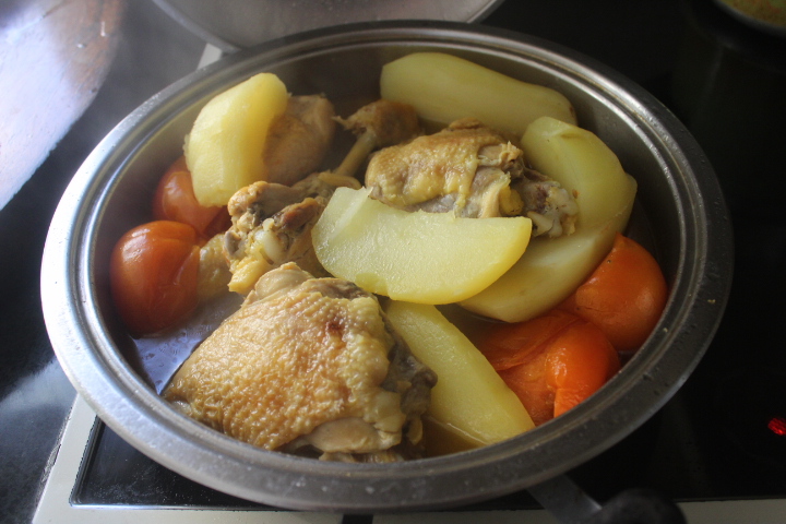 Dejamos cocerse hasta que las patatas estén casi tiernas y el pollo blandito, alrededor de una hora, vigilando y dando la vuelta, con cuidado de no romper las patatas cada 15 minutos aproximadamente.
