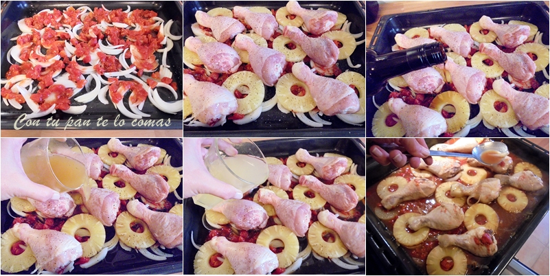 Es el caso del pollo con piña al horno, que hago muy a menudo en casa porque nos encanta y sobre todo porque es más simple que el mecanismo de un chupete. Se trata de poner todos los ingredientes en una fuente de horno y que se haga tranquilamente mientras te puedes dedicar a otras cosas. El resultado es una maravilla de pollo con sabor agridulce por la piña y el PX, y lo mejor, te ha costado cinco minutos prepararlo. Esta vez he utilizado muslitos de pollo pero puedes hacerlo con un pollo entero troceado, traseros o lo que más te guste.