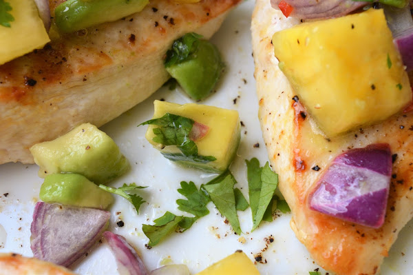 Hoy cocinamos pechugas de pollo simples a la plancha pero con un colorido y una explosión de sabores que es alucinante, que receta mas sencilla y que resultado cuando la pones en el plato, de entrada ya tu gente se quedará entusiasmada con el colorido de esa piña ácida amarilla, el cremosos aguacate verde, la cebolla un toque picante morada, el frescor de las hojas de cilantro y las motitas rojas de la guindilla, todo aderezado con la suavidad de la miel y un toque cítrico, resultado, maravilloso, no me digáis que no se os hace la boca agua, además os aseguro que es ligero y delicioso. Bon profit!!!!!!