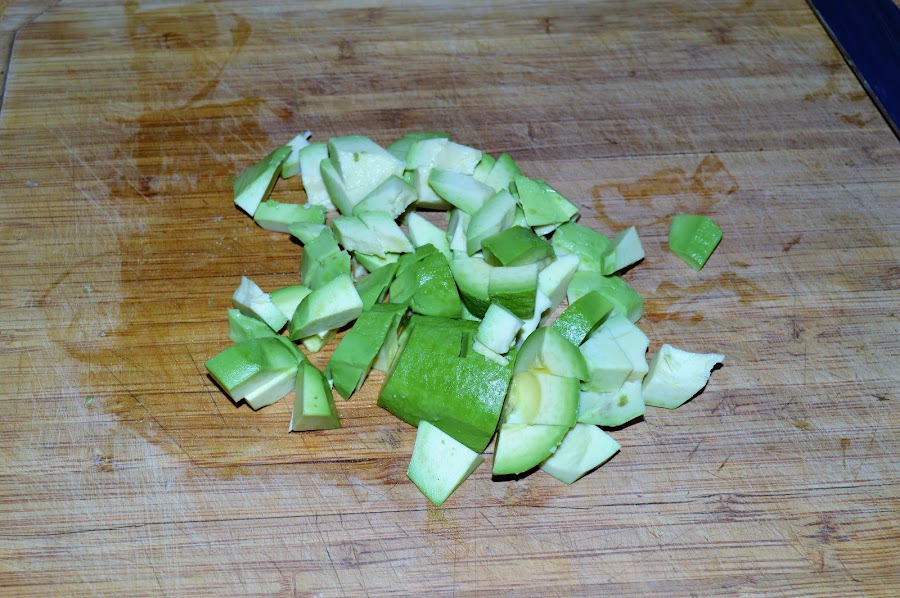 Cortamos en cuadraditos de mas o menos 1 cm. de grosor la piña, el aguacate, la cebolla y la reservamos.