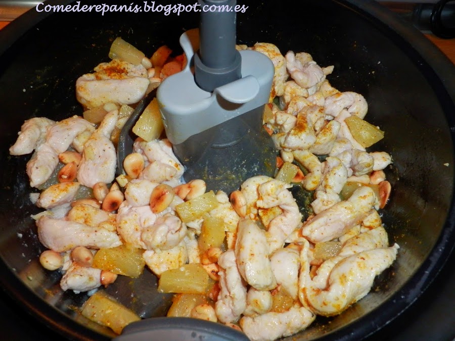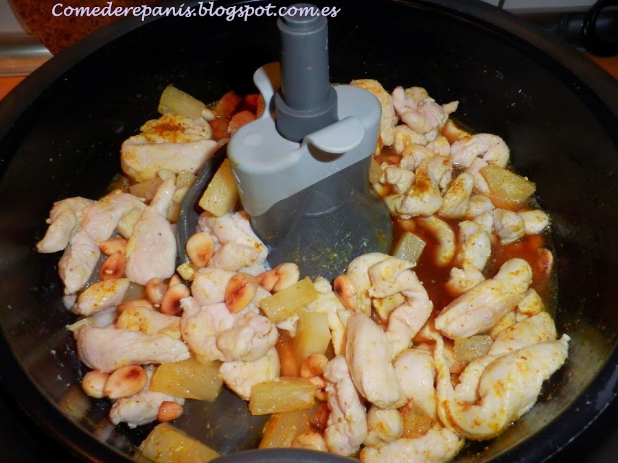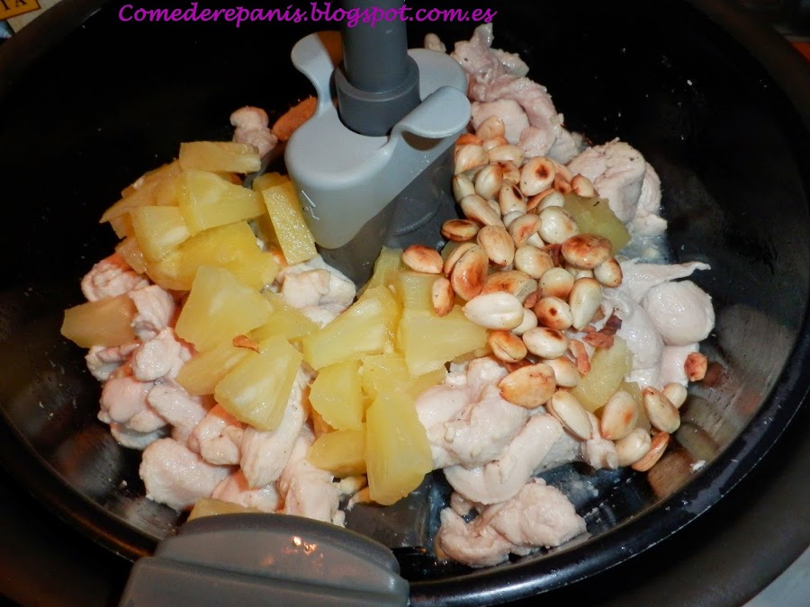 Transcurridos los cinco minutos apagamos la freidora y añadimos el jengibre, el curry, la piña y las almendras tostadas si no la tienes tostadas yo te explico aquí como tostar almendras. Mezclar todo eso y dejarlo en reposo otros 5 minutos para que las especies le den el sabor.