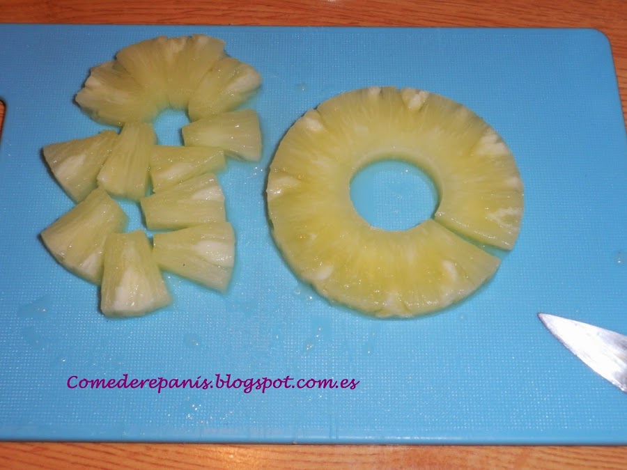 Mientras tenemos funcionando la actifry, cortamos en trozos la piña.
