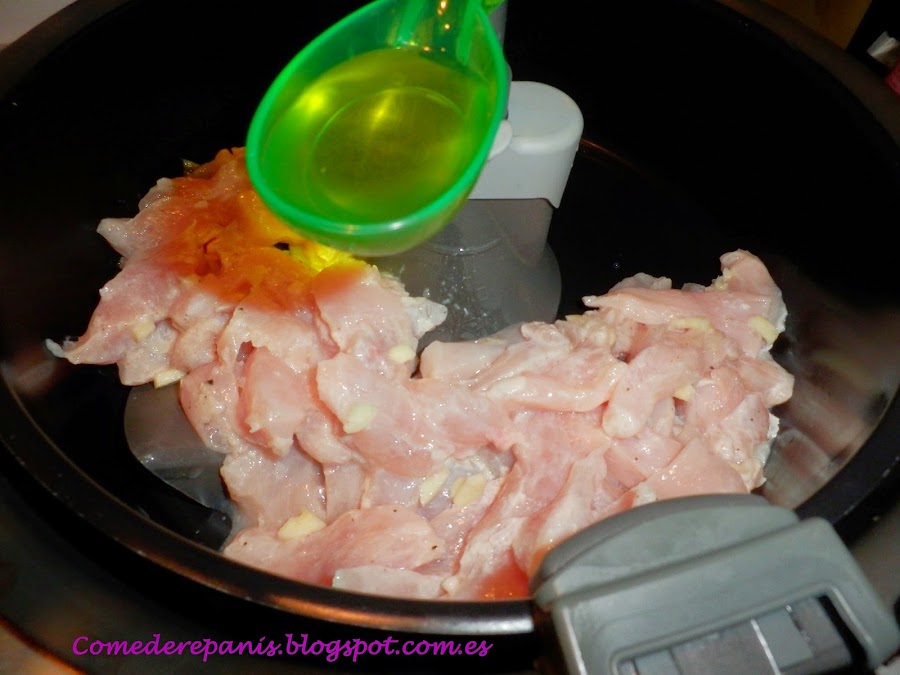 Pasados los 30 minutos, colocamos la pechuga macerada en la actifry con una cucharada de aceite y programamos 5 minutos.