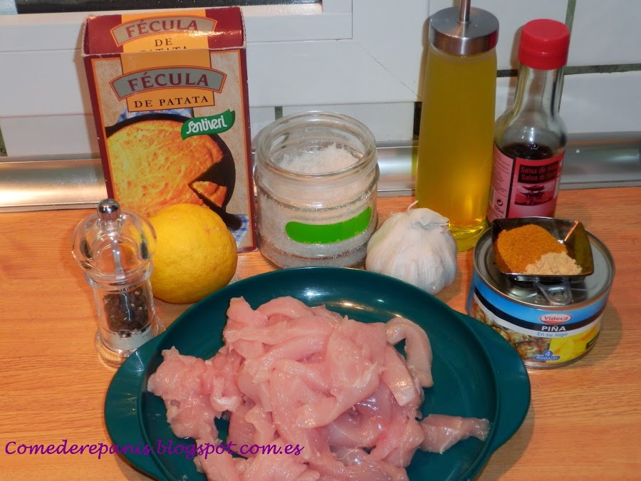 Aparte disolvemos la fécula de patata en el zumo de piña y lo añadimos a la carne.