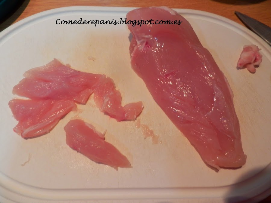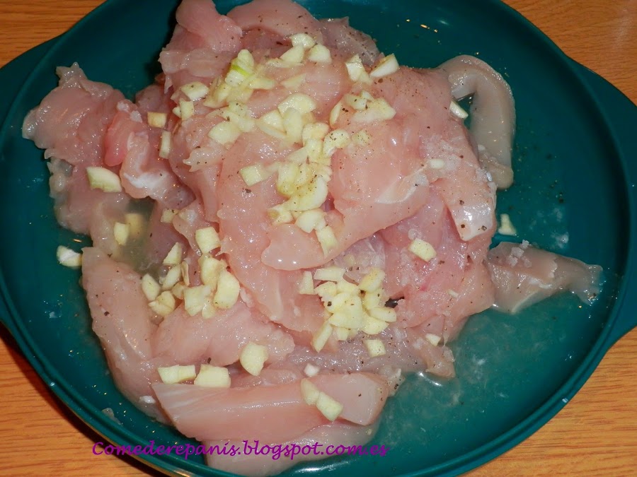 Salpimentar la pechuga, picar los ajos pequeñitos y añadírselos junto con el zumo de limón, ahora dejar macerar durante media hora aproximadamente.