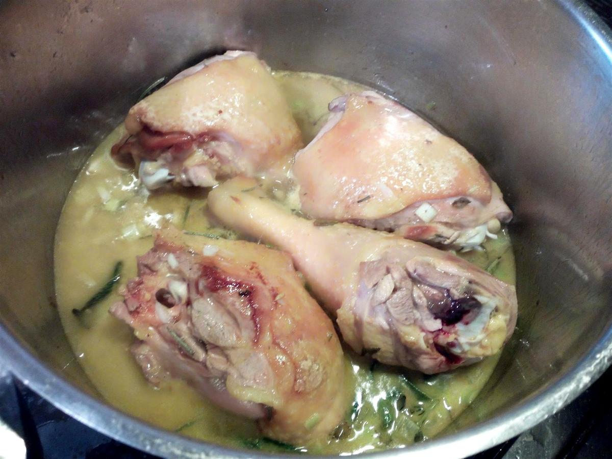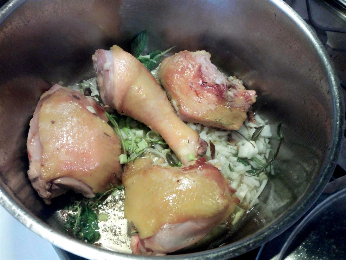 Salpimentar las piezas de pollo y dorar con aceite, jengibre y hierbas.