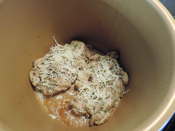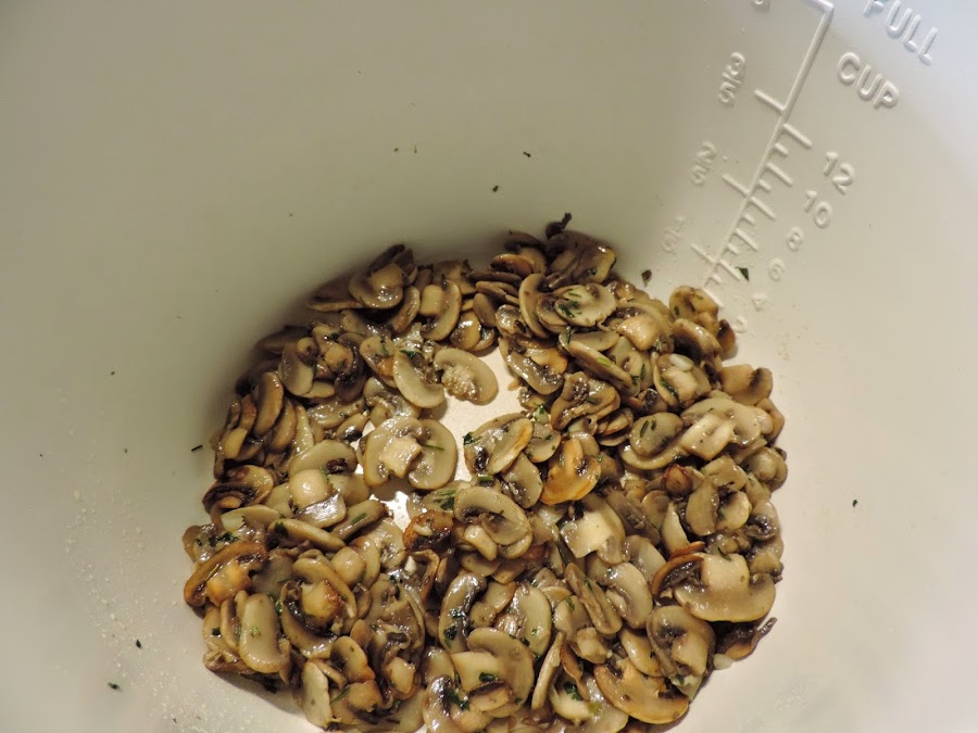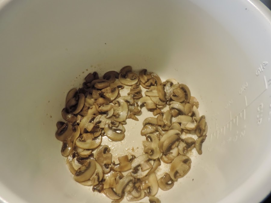 Elaboración:Limpiamos y cortamos los champiñones con ayuda del laminador, ponemos unas gotas de aceite de oliva y los echamos en la cubeta de la olla.