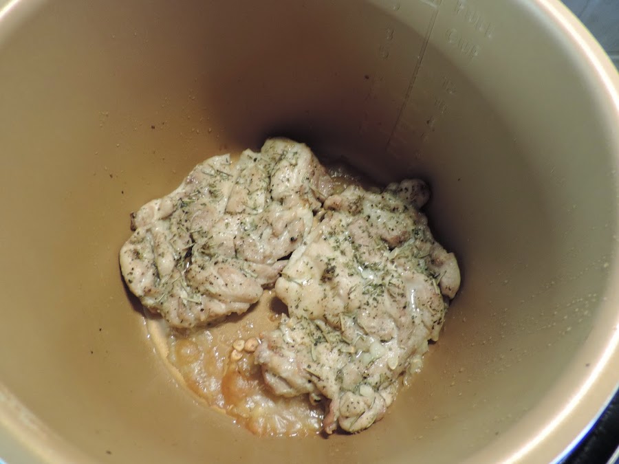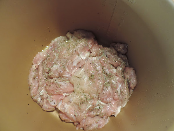 Echar unas gotas de aceite de oliva en la cubeta de la olla y poner la carne.
