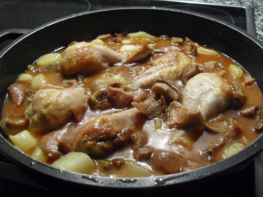 Poner a terminar de cocer las setas y las patatas a con el caldo, unos minutos, seguidamente añadir los muslos de pollo y añadir el vasito de vino blanco, remover y cocer unos 15 minutos minutos aproximadamente, removiendo de vez en cuando sin que se deshagan las patatas ni se peguen, hasta que el caldo espese según nuestro gusto.